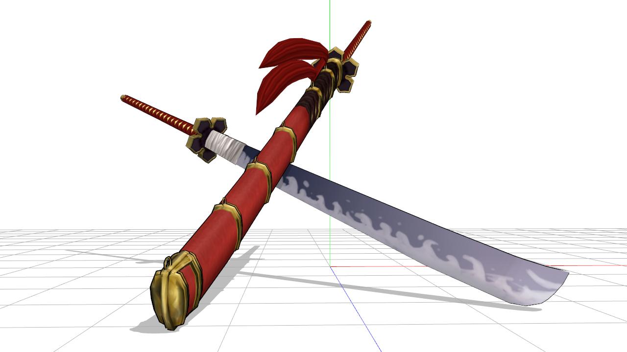 前回の記事に書いたように、刀を片手だけに持っていると使いにくいので、刀を両手に持たせて修正して、二本の刀をpmxアクセサリとして同封しました。